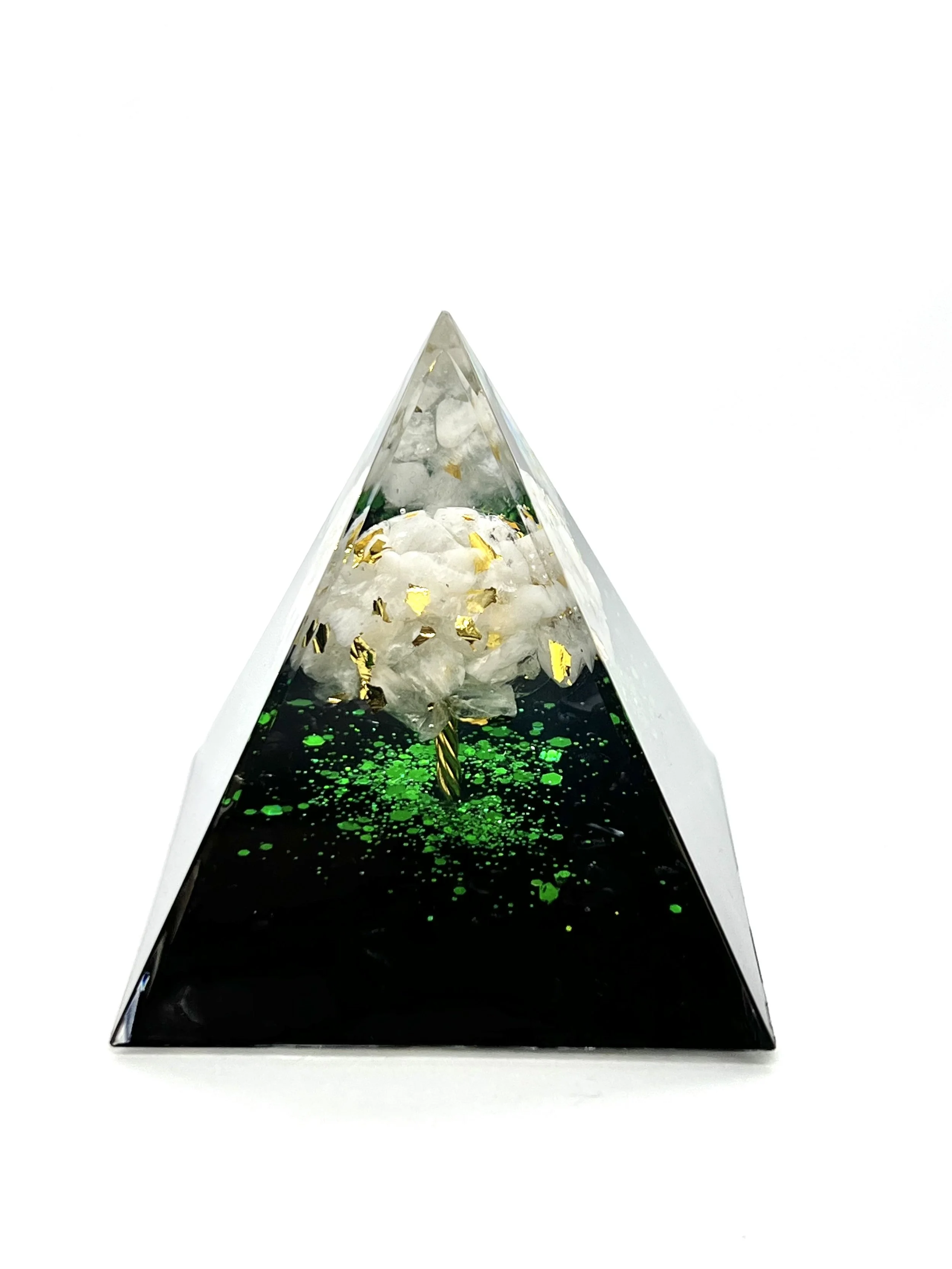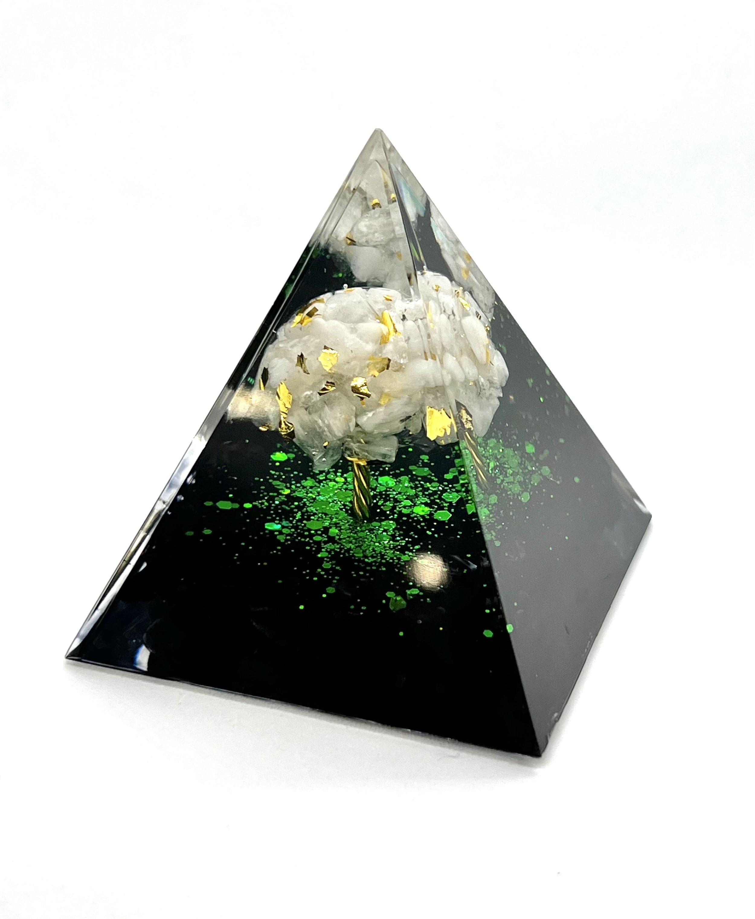 Obsidian with Quartz Tree and Gold Leaf Orgone Pyramid, a harmonious fusion of protection, spiritual growth, and opulence. This extraordinary pyramid features potent Obsidian crystals alongside a captivating tree crafted from Quartz and embellished with radiant gold leaf foil.